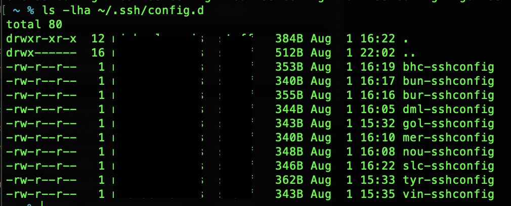 Now that we have the structure put together, using some naming schemes makes this all come together. We use a 3-letter code for our clients, so each config file is xxx-sshconfig. We store the config files with the client passwords in our password manager. If you have access to the passwords, you also have access to this config.